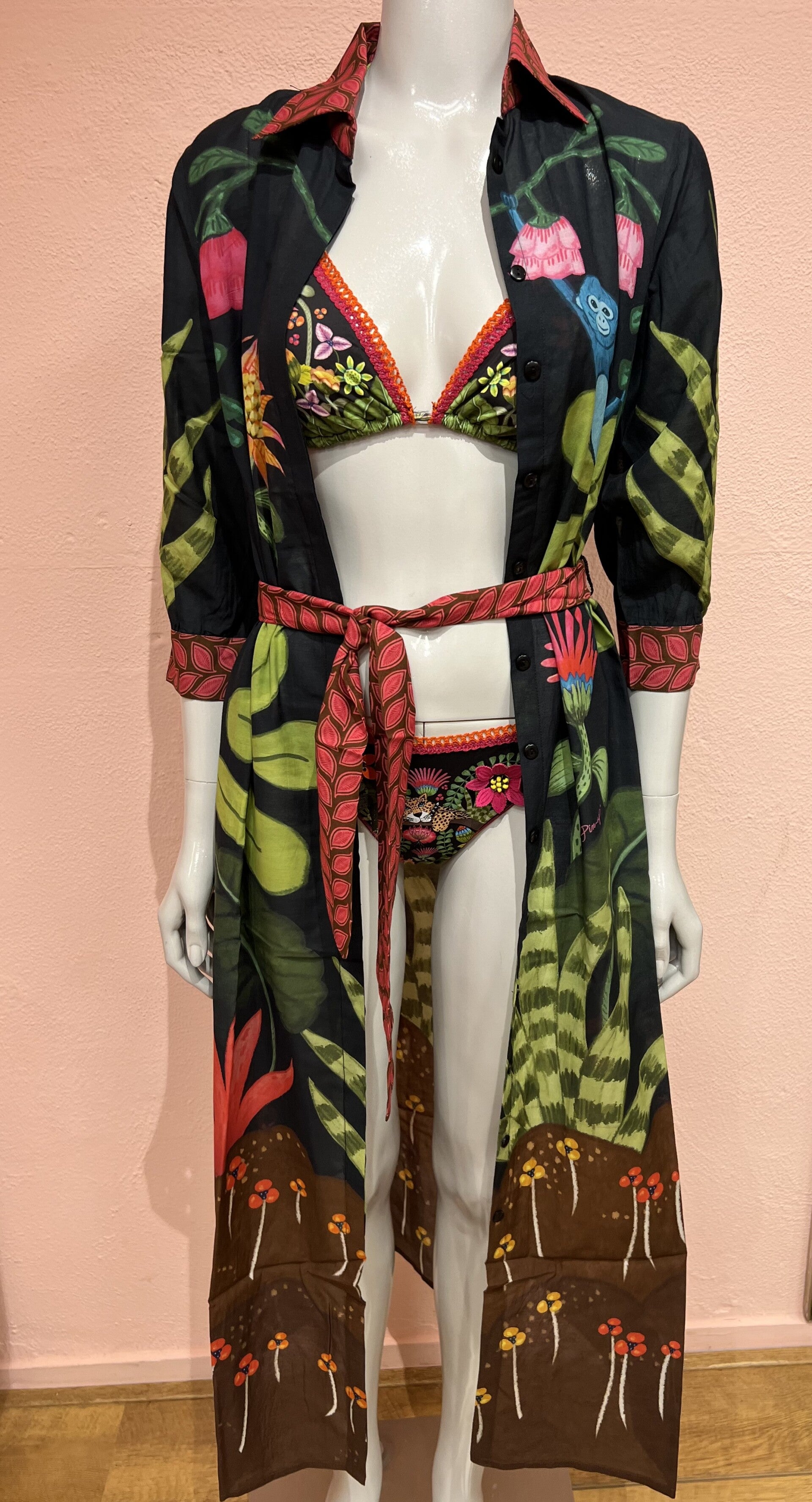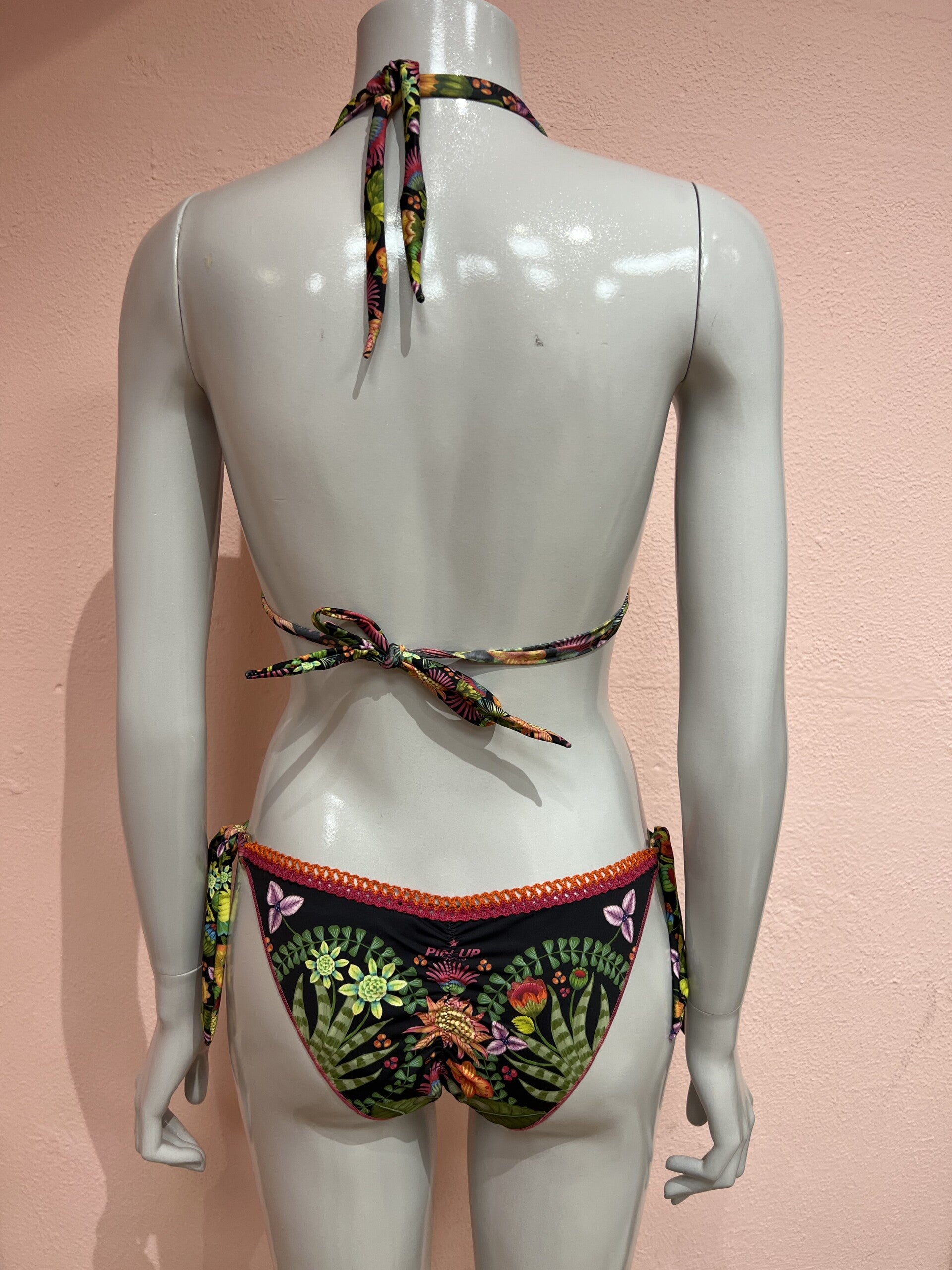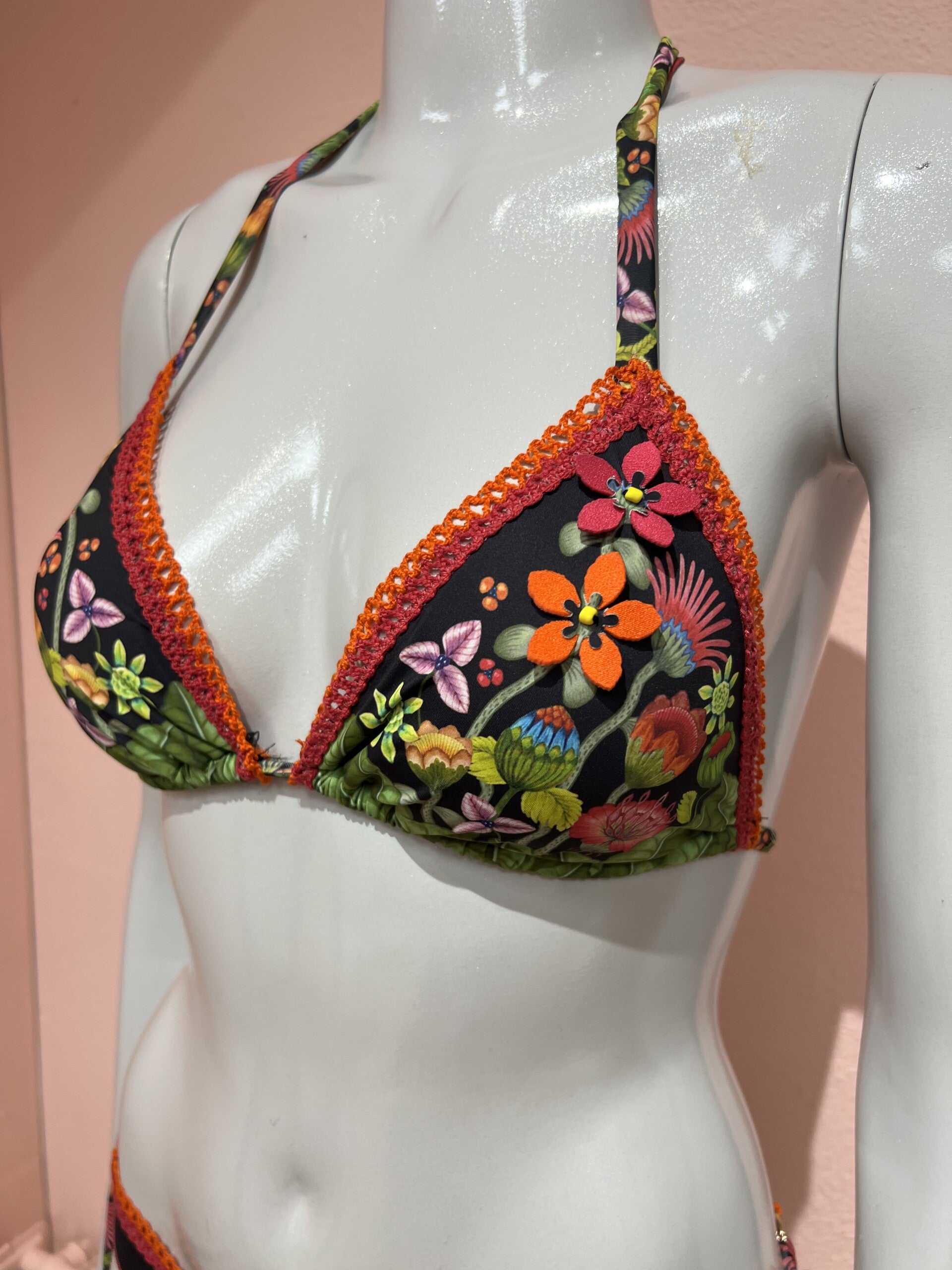 Refined bikini top brassiere and bikini bottom with crochet trim. The 3D laser application of leaves and flowers embellish the Jungla Attitude print. The must-have bikini for your next exotic vacation!