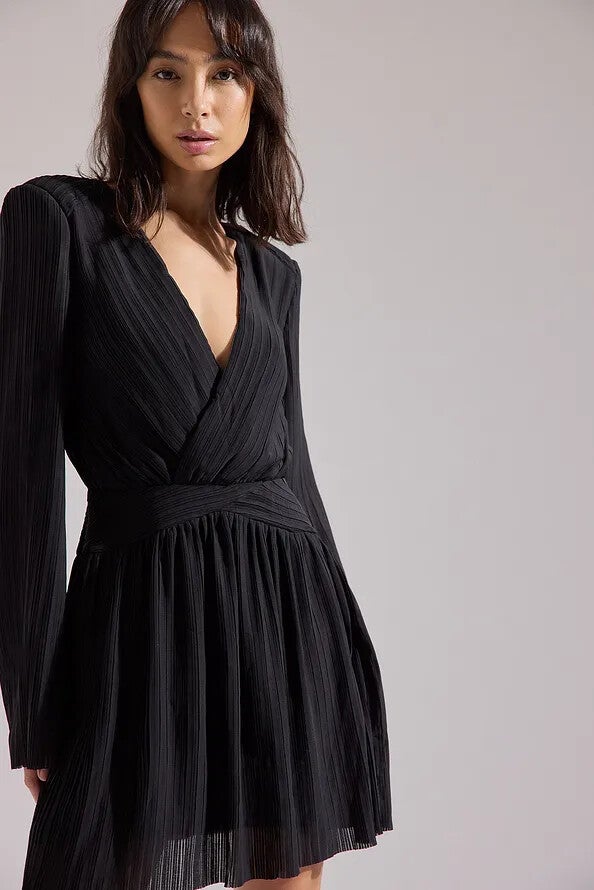Deze mini jurk is geplisseerd en heeft een wikkel-detail met een v-halslijn. Het heeft gewatteerde schouders en lange mouwen. De mini jurk heeft een verborgen ritssluiting aan de zijkant en een voering. Deze mini jurk komt in zwart. Influencer: @stephsa is 171 cm tall and is wearing size EU 38 (UK 12, US 8, medium).